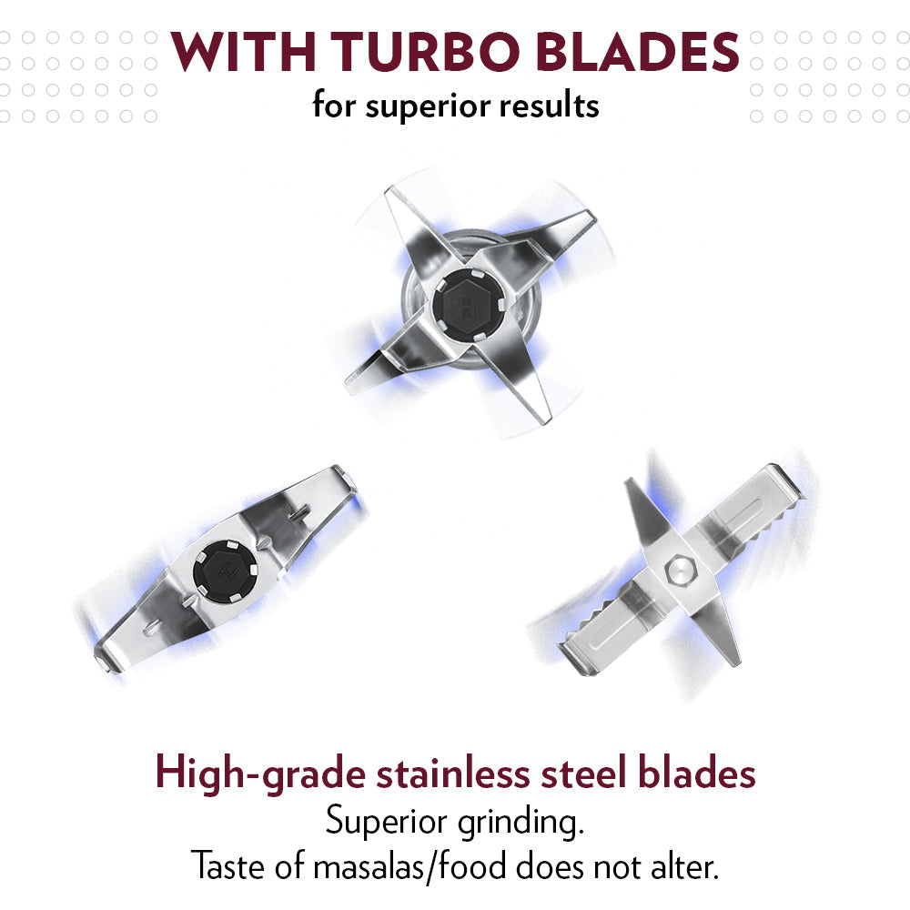 The Borosil Best Mixer Grinder (Maroon) has the lowest wattage of our Mixer Grinder series, but it still packs a pretty powerful punch. Built with Borosil no compromise quality, it has a durable rotary switch, inbuilt overload protectors, flow breakers in the food grade stainless steel jars for superior performance - ensuring that you will never miss your old mixer grinder!