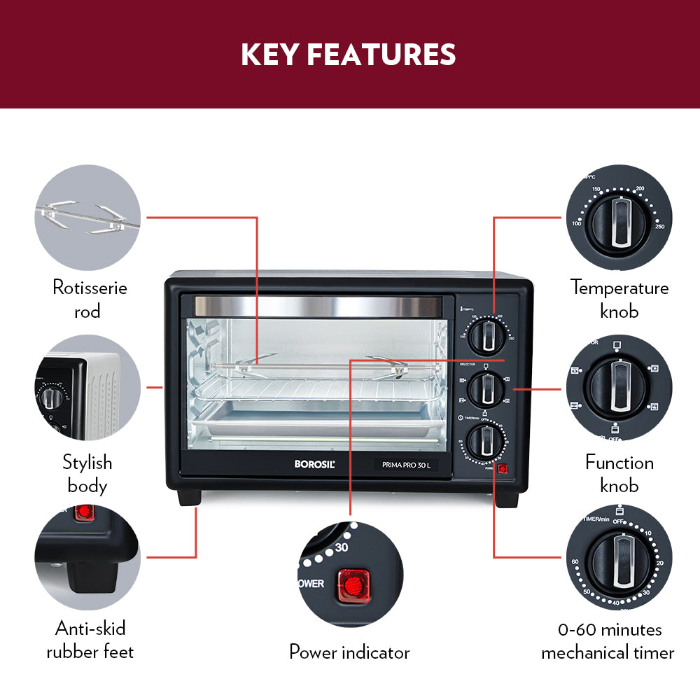 The Borosil Prima Pro 30L Oven Toaster Griller comes with convection heating to ensure efficient and even cooking, and a motorized rotisserie. It can be used for baking, grilling, shashliks etc. With easy to figure dial controls and a bright light so you can see the insides properly while cooking, once you switch to the Prima OTG, we guarantee you will never use anything else.