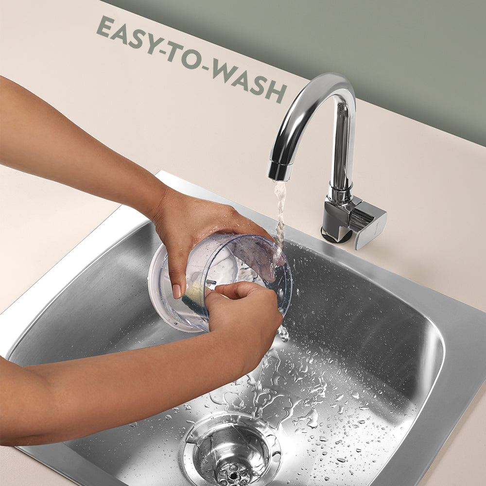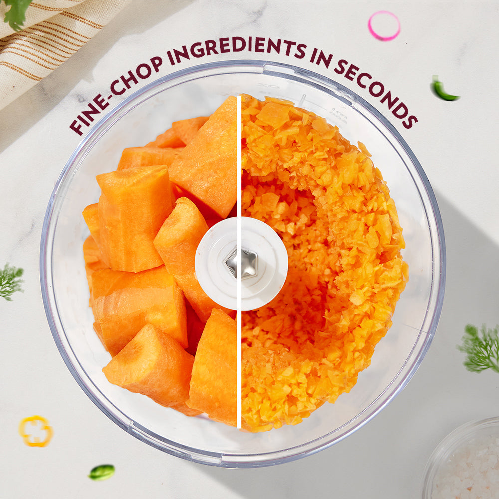 No more tears now while chopping onions, or smelly hands while chopping garlic. Use the powerful Borosil Chef Delite 260W Chopper to make your daily cooking a breeze - it gets rid of the pain of preparation so you can enjoy the process of the actual cooking. This electric vegetable chopper comes with two blades - a single blade and a dual blade for fine chopping. This salad cutter chopper truly makes cooking a delight - it does your chopping in seconds!