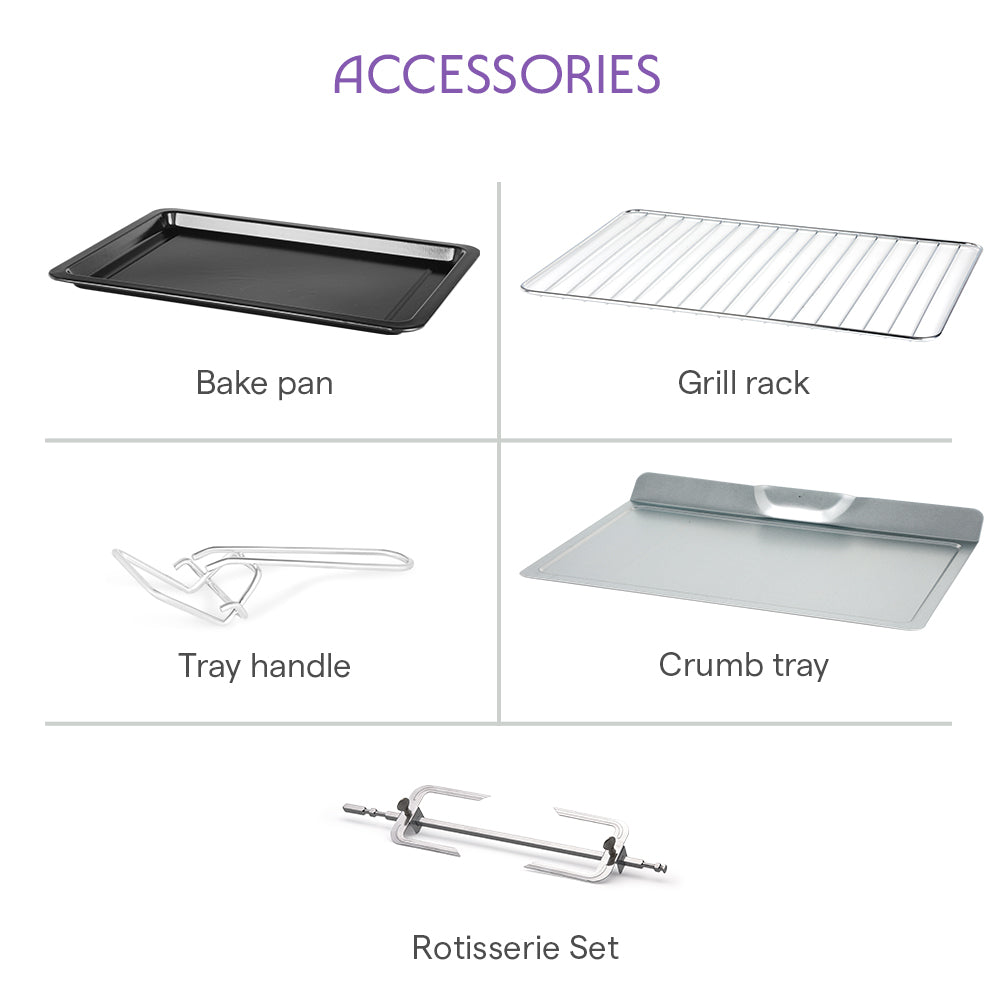 The Prima Plus 25L Oven Toaster Griller is great for baking croissants, cookies cakes, bread, pizzas, muffins, shashliks, bakes etc. It comes with all the accessories you need - crumb tray, tray handle (so that you don't need oven mitts), rotisserie handle, rotisserie axis, rotisserie fork and a recipe book with an array of delicious recipes!